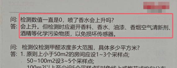 对此,《消费者报道》记者查询了该款甲醛检测仪的说明书,发现说明书上明确提及“检测时应避开香料、香水、油漆、香烟空气清新剂、酒精等化学污染物质。”