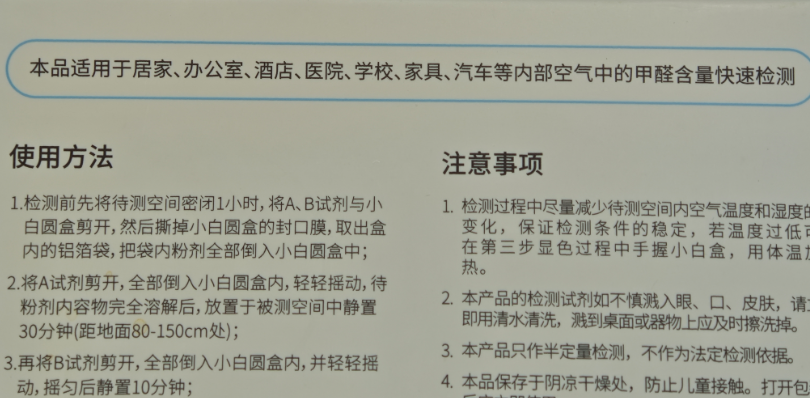 甲醛自测盒,又叫甲醛测试盒,是一种通过颜色反应来自行测试空气中甲醛含量的产品。记者查看该款产品的包装时发现,甲醛自测盒上明确写明:适用于居家、办公室、酒店、医院、学校、家具、汽车等内部空气中的甲醛含量快速检测。