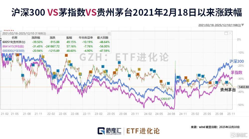 今年茅台股东的日子不轻松。2025年沪深300指数涨16.69%,茅指数涨20.01%,贵州茅台股价却跌了6.15%。