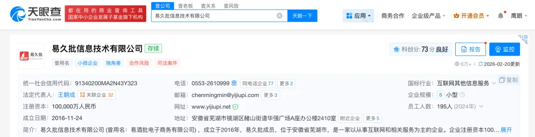 公开资料显示,易久批是一家快销品批发平台,关联公司为易久批信息技术有限公司,天眼查显示,该公司成立于2016年11月,注册资本10亿元,法定代表人为王朝成。