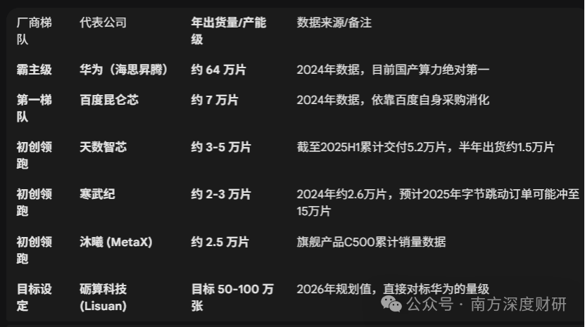 从行业已有出货情况来看,不同公司之间差异挺大,华为昇腾出货量最高,约60多万片,其次是昆仑芯,寒武纪据悉2025年全年将冲刺14.5万片。