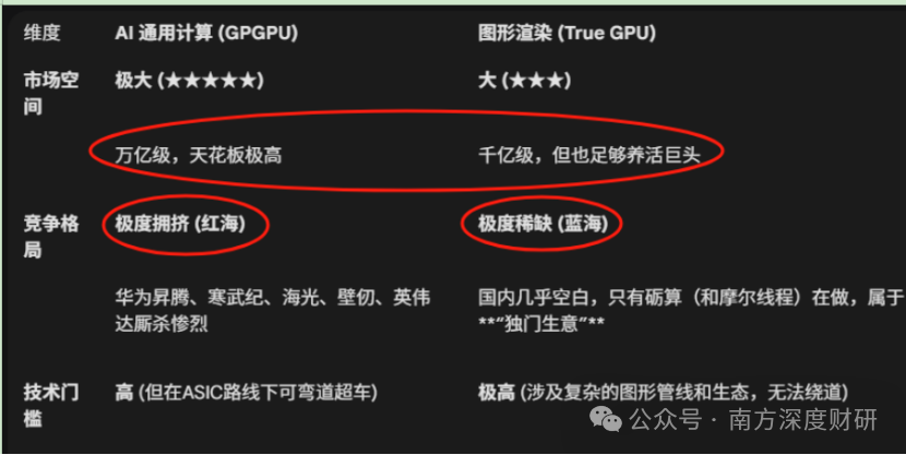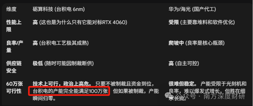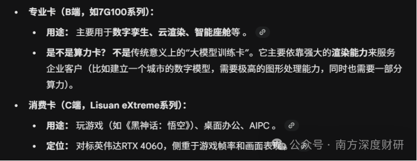 主要差别是,相较于国内做算力卡的gpu厂商,无法使用台积电先进制程,只能由中芯国际代工,砺算的图形渲染卡是由台积电代工,而且用的成熟制程,砺算的实际出货能力只取决于台积电晶圆产能的紧张程度,虽然未来可能存在代工风险。