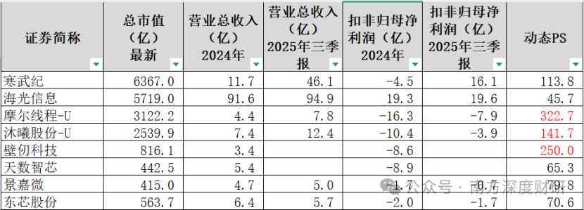 3、成长性预期:以寒武纪为例,从2024年营收11.7亿,到2025年三季度达到了46.1亿。这种4倍以上的爆发式增长,PS从300多倍降至113倍。