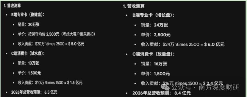 对其分别进行保守(仅按30万张)、中性测试(按40万张),2026年收入预计在6.5-8.4亿之间,如下: