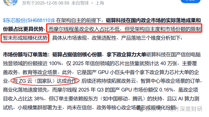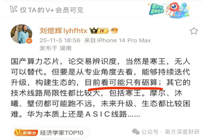 2025年11月5日,知名经济学家刘煜辉在其圈子内公开点评指出,称从专业角度和生态构建能力看,与包括寒武纪、华为等在内的GPU厂商对比,砺算可能是国内唯一能像英伟达一样兼顾图形与计算的“正统”GPU厂商。