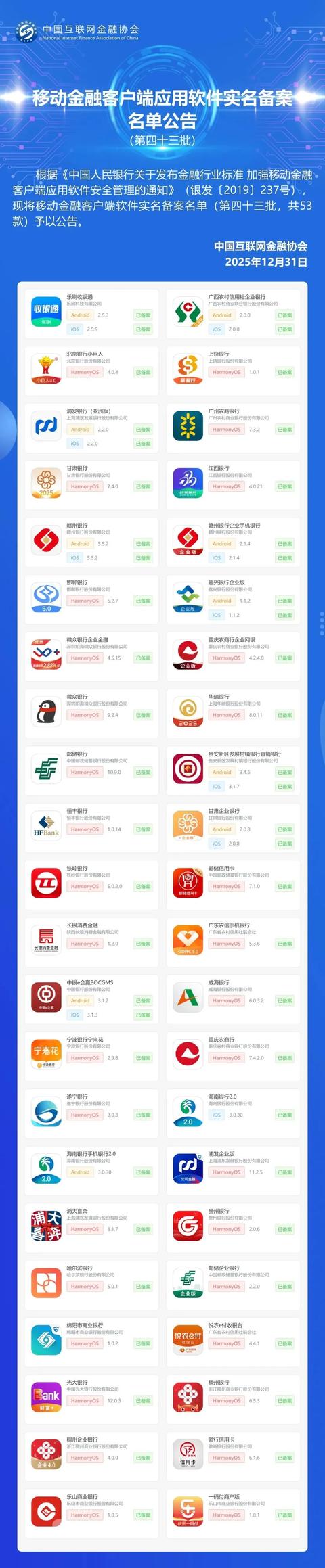 1月7日讯,中国互联网金融协会官方公众号显示,长银消费金融、光大银行等53款移动金融App实名备案。
