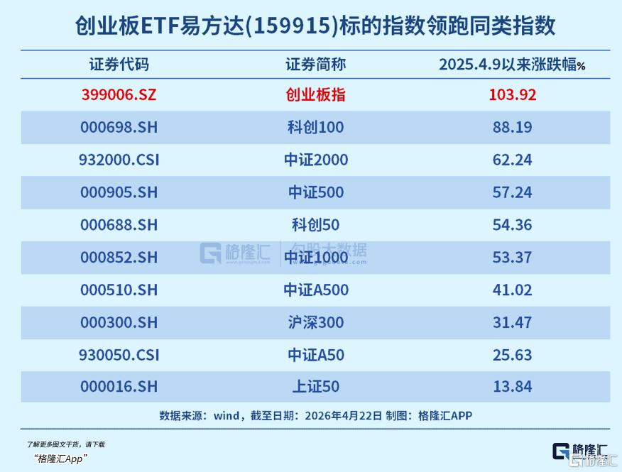 自2025年4月9日以来,创业板指涨幅103.92%,领涨宽基指数。