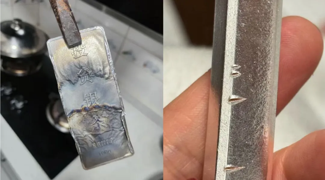 蓝鲸记者观察到,有不少消费者在社交平台上爆料买到了“假银条”。记者了解到,他们普遍是近期或者2025年末在电商平台上购买的银条,到货后发现经火烧迅速变形、银涂层下是其他金属比如铜。