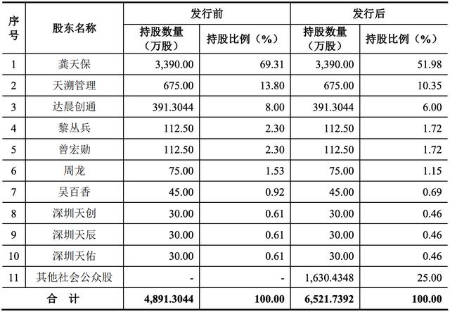 而本次上市前,龚天保直接持股69.31%,为天溯计量的控股股东。同时,龚天保在天溯管理、深圳天辰、深圳天创、深圳天佑出任执行事务合伙人,通过一致行动人吴百香可以实际控制天溯计量0.92%的股份比例,合计控制该公司85.86%的表决权。