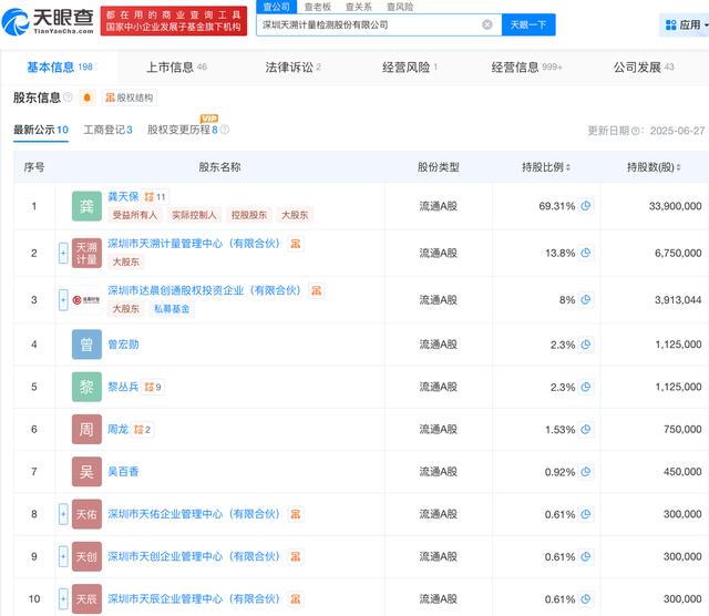 天眼查App信息显示,天溯计量成立于2009年6月。目前,该公司的注册资本约为4891.3044万元,法定代表人为龚天保,主要股东包括龚天保、深圳市天溯计量管理中心(有限合伙)等。