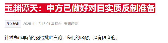 11月15日,玉渊谭天发文“中方已做好对日实质反制准备”。文中表示,针对高市早苗的露骨挑衅言论,我们的忍耐,是有限度的。如果日方执迷不悟,中国就没有什么好再克制的了。