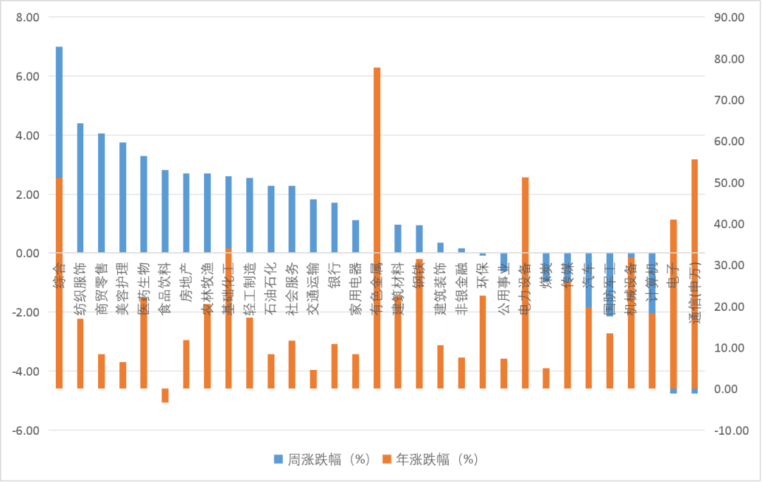 分行业来看,本周综合、纺织服饰、商贸零售、美容护理、医药生物等行业领涨,通信、电子、计算机等行业领跌,可以看到,领涨的行业年内涨幅相对落后,而领跌的行业的年对涨幅靠前,高低切明显,而实际上这一风格切换从10月份就已经开始了。