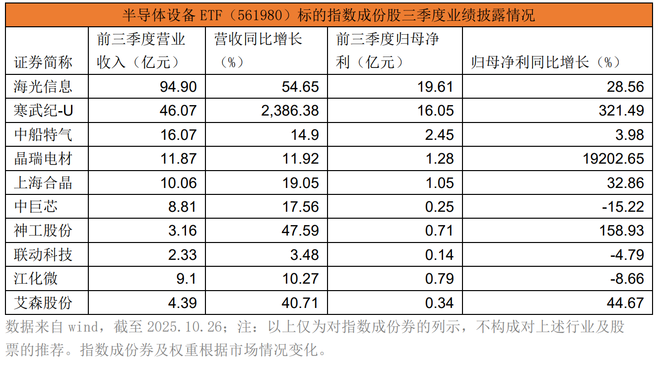 业绩方面,近期半导体设备ETF(561980)标的指数中多家成份股披露三季报业绩公告。