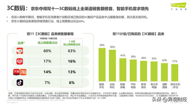 然而,从京东2025年第三季度披露的财报来看,这种担忧在很大程度上并不成立。尽管去年带电品类受益于国家补贴实现了高增长,今年三季度在高基数和补贴退坡的背景下,该板块仍然实现了稳定增长,显示出京东在该领域的市场地位依然稳固。根据艾瑞咨询发布的2025年双11观察数据,京东在带电品类的线上销售额继续位列第一,其3C数码类线上销售额占比高达60%,远超其他平台,展现出强大的市场号召力。