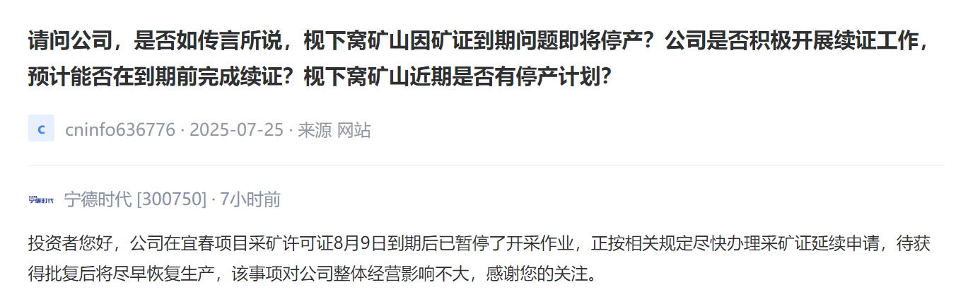8月11日一早,宁德时代在互动平台回复投资者提问表示,公司在宜春项目采矿许可证8月9日到期后已暂停了开采作业,正按相关规定尽快办理采矿证延续申请,待获得批复后将尽早恢复生产,该事项对公司整体经营影响不大。