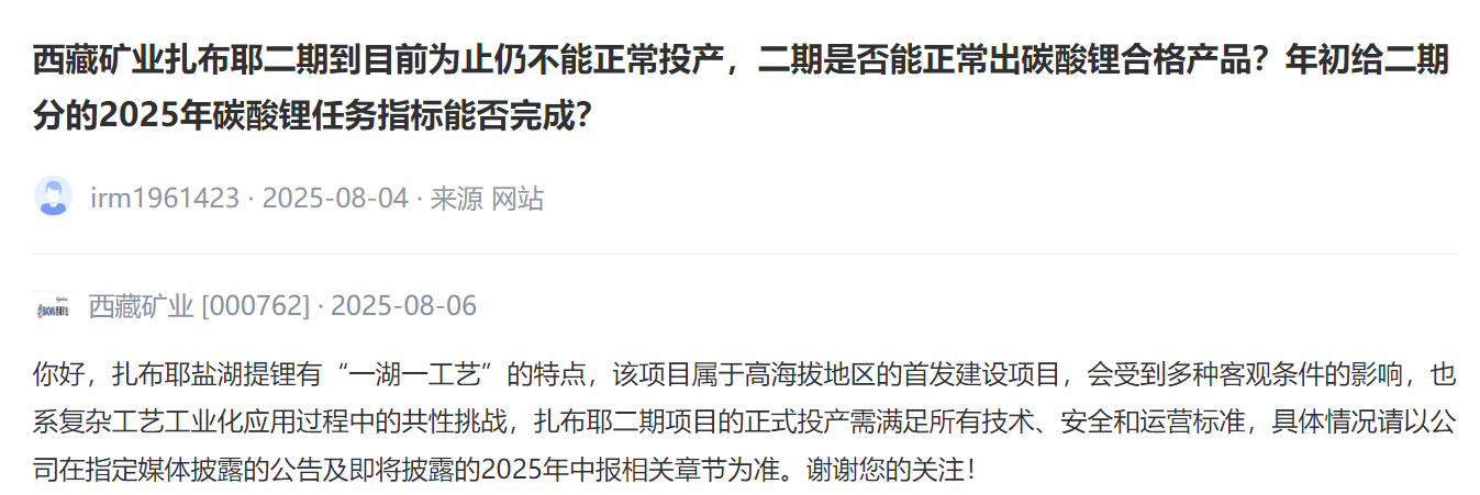 【投资者问】西藏矿业扎布耶二期到目前为止仍不能正常投产,二期是否能正常出碳酸锂合格产品?年初给二期分的2025年碳酸锂任务指标能否完成?