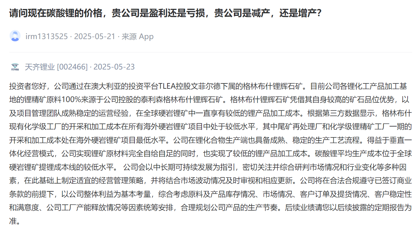 【投资者问】现在碳酸锂的价格,贵公司是盈利还是亏损,贵公司是减产,还是增产?