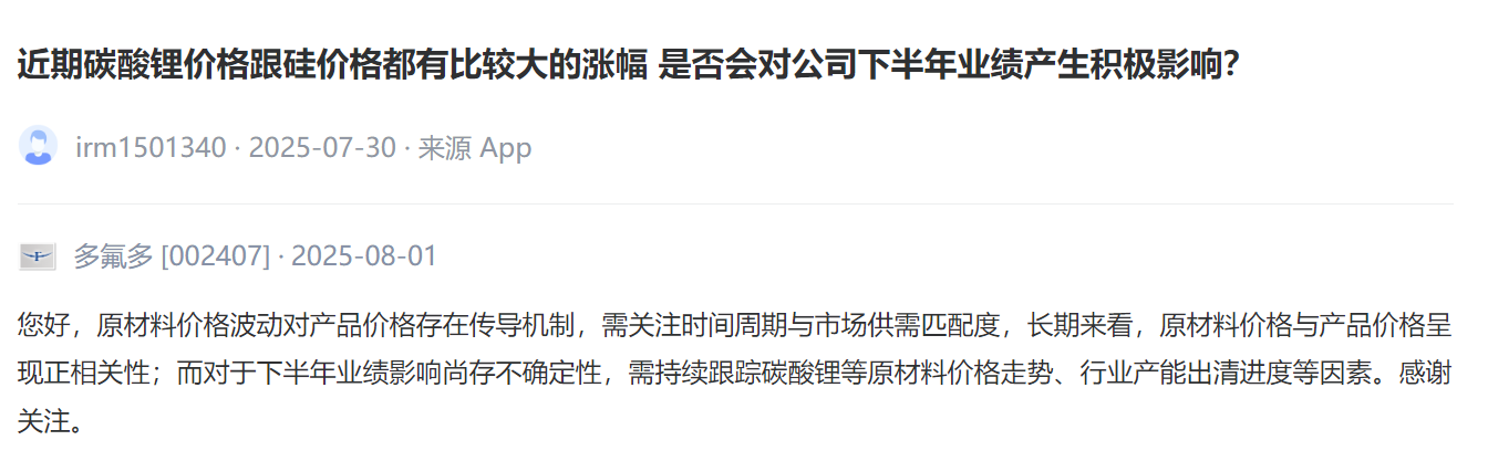 多氟多 [002407] :原材料价格波动对产品价格存在传导机制,需关注时间周期与市场供需匹配度,长期来看,原材料价格与产品价格呈现正相关性;而对于下半年业绩影响尚存不确定性,需持续跟踪碳酸锂等原材料价格走势、行业产能出清进度等因素。