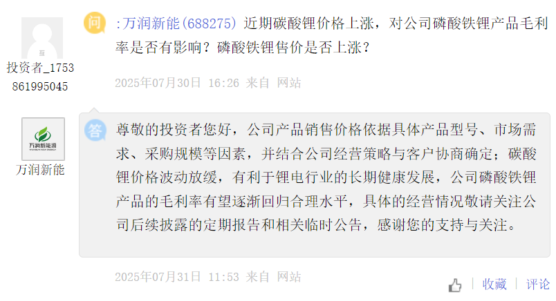 【投资者问】近期碳酸锂价格上涨,对公司磷酸铁锂产品毛利率是否有影响?磷酸铁锂售价是否上涨?