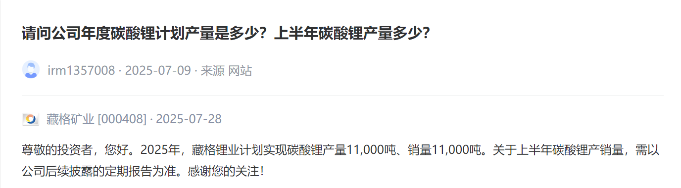【投资者问】公司年度碳酸锂计划产量是多少?上半年碳酸锂产量多少?
