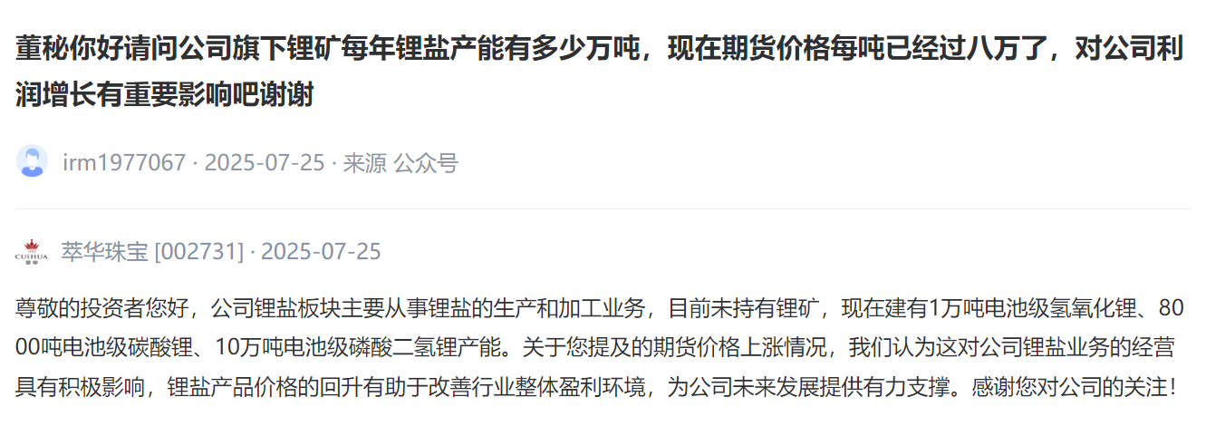 萃华珠宝 [002731] :公司锂盐板块主要从事锂盐的生产和加工业务,目前未持有锂矿,现在建有1万吨电池级氢氧化锂、8000吨电池级碳酸锂、10万吨电池级磷酸二氢锂产能。关于您提及的期货价格上涨情况,我们认为这对公司锂盐业务的经营具有积极影响,锂盐产品价格的回升有助于改善行业整体盈利环境,为公司未来发展提供有力支撑。