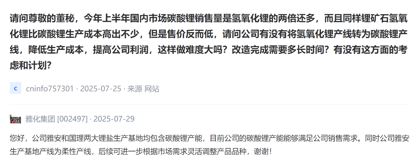【投资者问】今年上半年国内市场碳酸锂销售量是氢氧化锂的两倍还多,而且同样锂矿石氢氧化锂比碳酸锂生产成本高出不少,但是售价反而低,请问公司有没有将氢氧化锂产线转为碳酸锂产线,降低生产成本,提高公司利润,这样做难度大吗?改造完成需要多长时间?有没有这方面的考虑和计划?