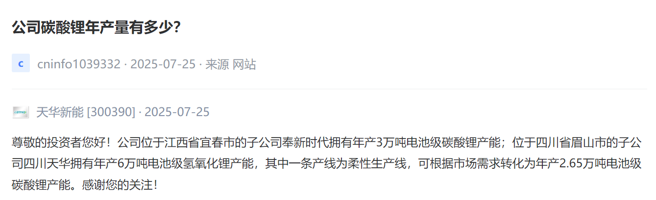 天华新能 [300390] :公司位于江西省宜春市的子公司奉新时代拥有年产3万吨电池级碳酸锂产能;位于四川省眉山市的子公司四川天华拥有年产6万吨电池级氢氧化锂产能,其中一条产线为柔性生产线,可根据市场需求转化为年产2.65万吨电池级碳酸锂产能。