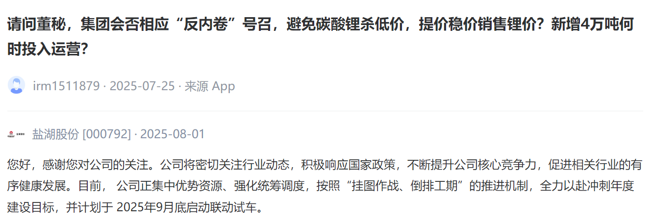 【投资者问】集团会否相应“反内卷”号召,避免碳酸锂杀低价,提价稳价销售锂价?新增4万吨何时投入运营?