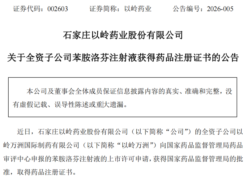 与业绩预告同日落地的,是以岭药业全资子公司以岭万洲国际制药有限公司(以下简称“以岭万洲”)的苯胺洛芬注射液获得国家药监局药品注册证书的公告。