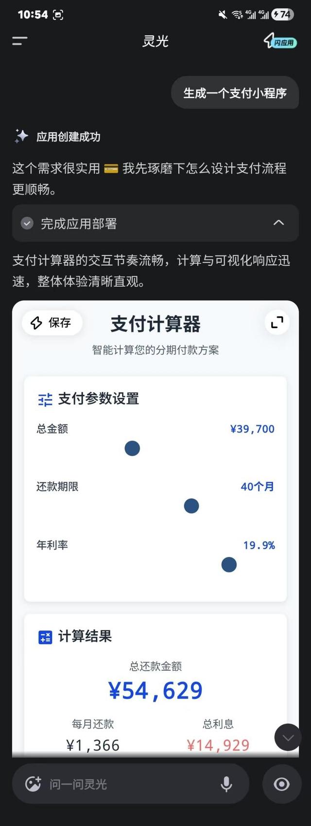 相比多模态能力,灵光最有意思的是“闪应用”,用一句话就能生成应用、小程序,但实际的体验下来,与其说是生成程序,不如说是生成了一个看起来高级一点的交互卡片/H5应用。