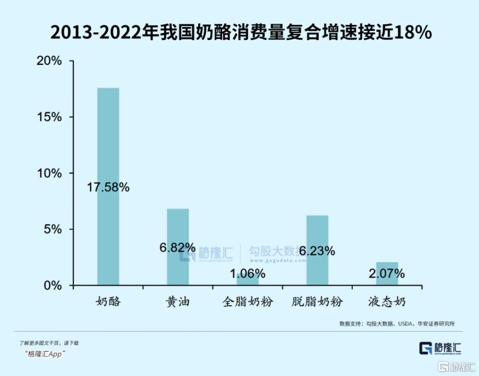 从行业背景看,奶酪市场是当时乳制品行业中为数不多的高成长“蓝海”。根据华安证券研究所研报,2013-2022年奶酪消费量复合增长率接近18%,远高于奶粉和液态奶。对于蒙牛而言,奶酪是乳业“结构升级”的关键突破口。