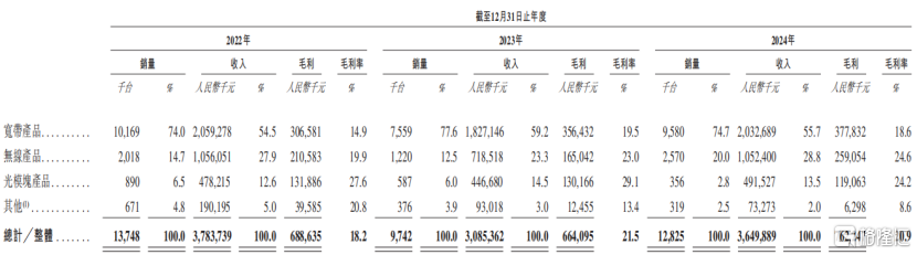 按产品线划分,宽带产品是公司的主要收入来源,报告期内收入占比分别为54.5%、59.2%、55.7%、58.6%。