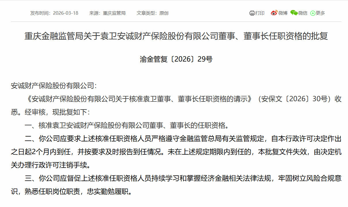 蓝鲸新闻3月18日讯(记者 陈晓娟)今日,金融监管总局重庆监管局公告,核准袁卫安诚财产保险股份有限公司(下称“安诚财险”)董事、董事长的任职资格。