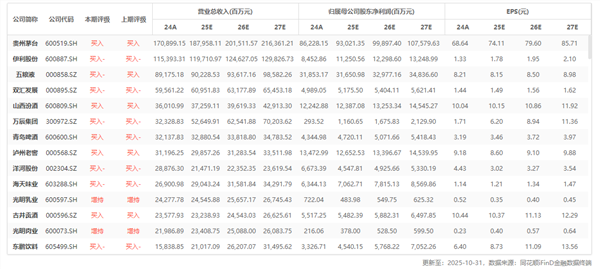 行业重点公司最新盈利预测综合值