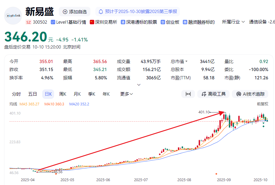 其中,新易盛更是被誉为“易中天”的领头羊。仅今年以来,新易盛的股价就从最低的46.56元,涨至401.10元的最高点,涨幅高达861%。