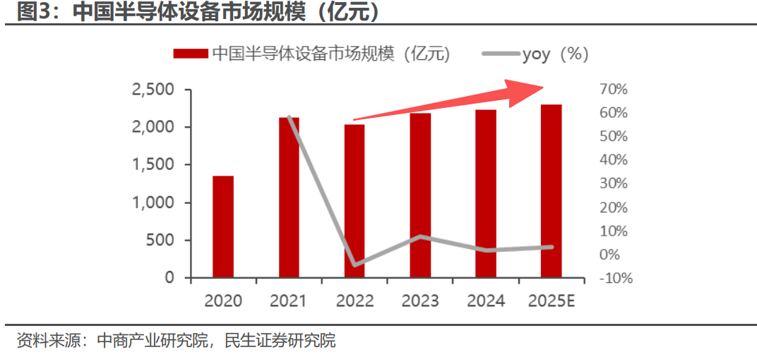 再加上受益于国家政策、AI浪潮、周期上行、自主可控持续推进等因素,近年来我国半导体设备市场规模持续增长。根据中商产业研究院,2023年中国半导体设备市场规模约为2190.24亿元,占全球市场份额的35%,2024年约为2230亿元,预计2025年中国半导体设备市场规模将达2300亿元。