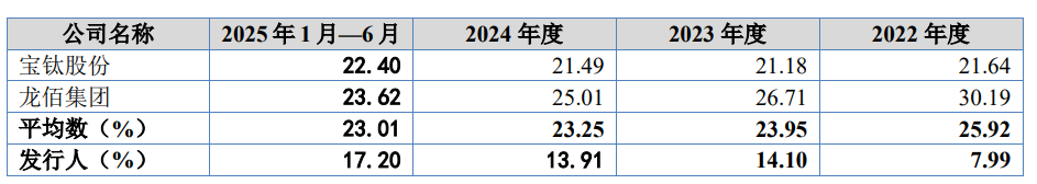 2022-2025年上半年,金钛股份的毛利率分别为7.99%、14.10%、13.91%和17.2%,同期,宝钛股份、龙佰集团的毛利率均值分别为25.92%、23.95%、23.25%和23.01%,相比之下,金钛股份的毛利率大幅低于同行业可比公司的均值。毛利率出现这种“过山车”式的变化,反映出公司盈利能力的稳定性不足。