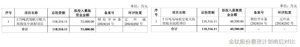 金钛股份此次IPO拟募资4.05亿元,用于“2万吨高端航空航天海绵钛全流程项目”。值得注意的是,金钛股份原计划募资7.50亿元,而上会稿中拟募资规模缩减至4.05亿元。另外,这个募投项目的建设周期长达4.5年,于启动后第六年达产。如此长的投资回报周期,充满不确定性。