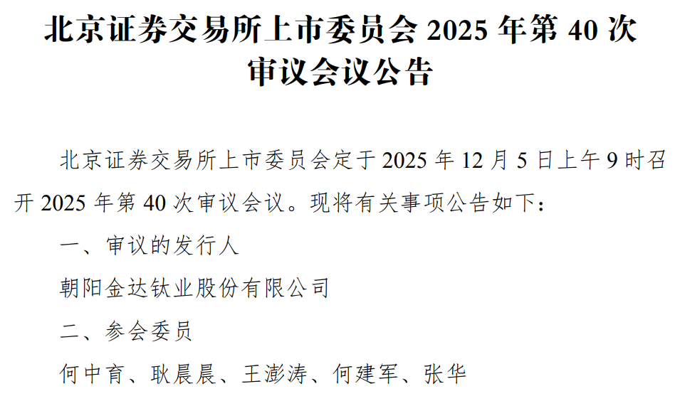 中国产经观察消息:2025年12月5日,朝阳金达钛业股份有限公司(以下简称“金钛股份”)即将迎来北交所上市委员会的审议。作为深耕高端海绵钛产品十余年的企业,金钛股份头顶诸多光环,如国内领先、国际一流的高端海绵钛生产基地,中国钛行业产业链核心成员之一,还是我国最早一批实现航空航天、国防军工领域用高端海绵钛产品批量化生产的企业。然而,在看似辉煌的背后,金钛股份却隐藏着诸多可能影响其顺利上市的负面因素。