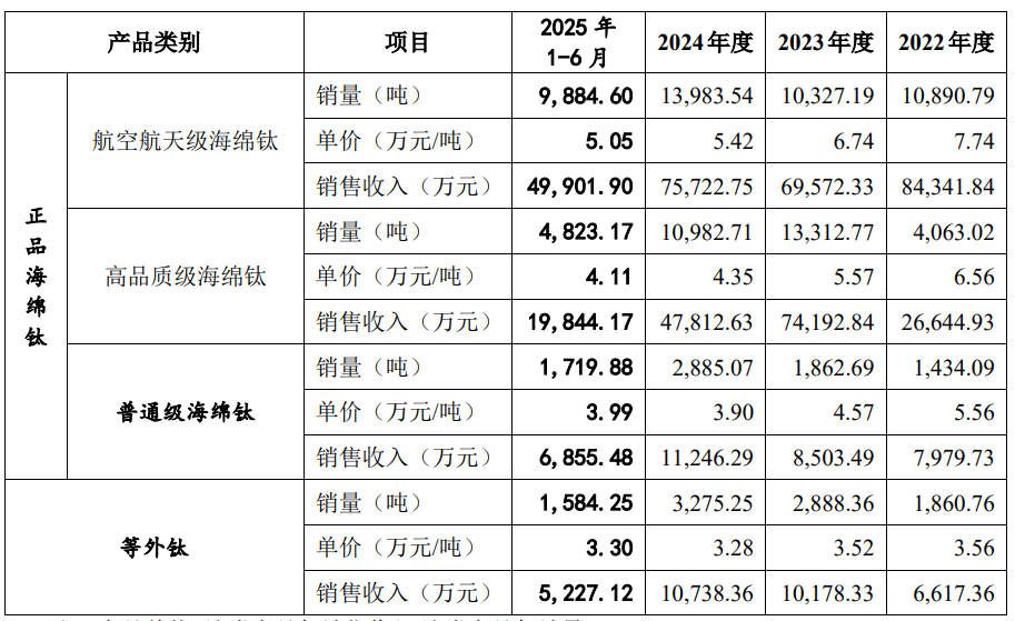 这种业绩下滑并非偶然。招股书显示,金钛股份主要产品各级别海绵钛和等外钛的销售单价均出现持续下滑。2022-2025年上半年,航空航天级海绵钛各期销售单价分别为7.74万元/吨、6.74万元/吨、5.42万元/吨、5.05万元/吨;高品质级海绵钛销售单价分别为6.56万元/吨、5.57万元/吨、4.35万元/吨、4.11万元/吨;普通级海绵钛销售单价分别为5.56万元/吨、4.57万元/吨、3.9万元/吨、3.99万元/吨;等外钛销售单价分别为3.56万元/吨、3.52万元/吨、3.28万元/吨、3.3万元/吨。产品单价的下降直接影响了公司的营收和利润,也让市场对其未来业绩增长的稳定性产生了质疑。