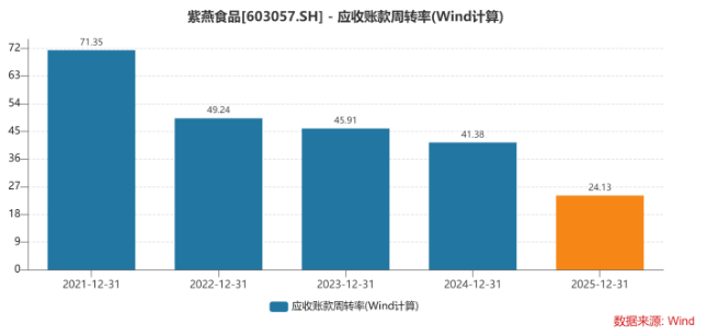 2025年,紫燕食品应收账款周转天数较上年同期增加了6.22天,应收账款周转率由上年的41.38次下降至24.13次。截至2025年末,公司应收账款为1.79亿元,同比大幅增长99.79%,应收账款规模的增长也进一步导致公司经营活动产生的现金流量净额同比下降45.32%。