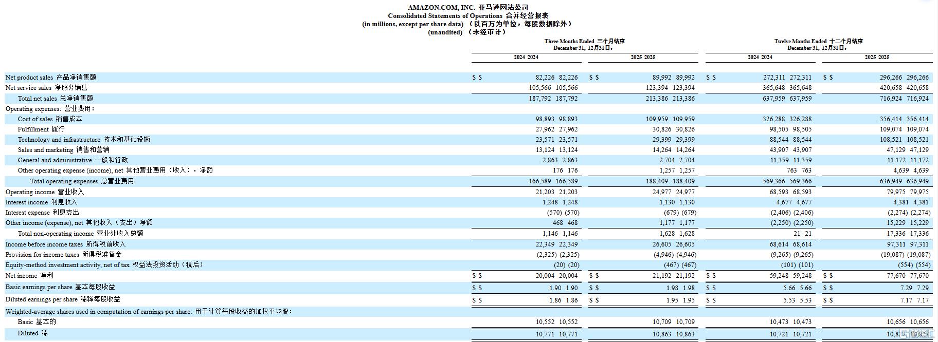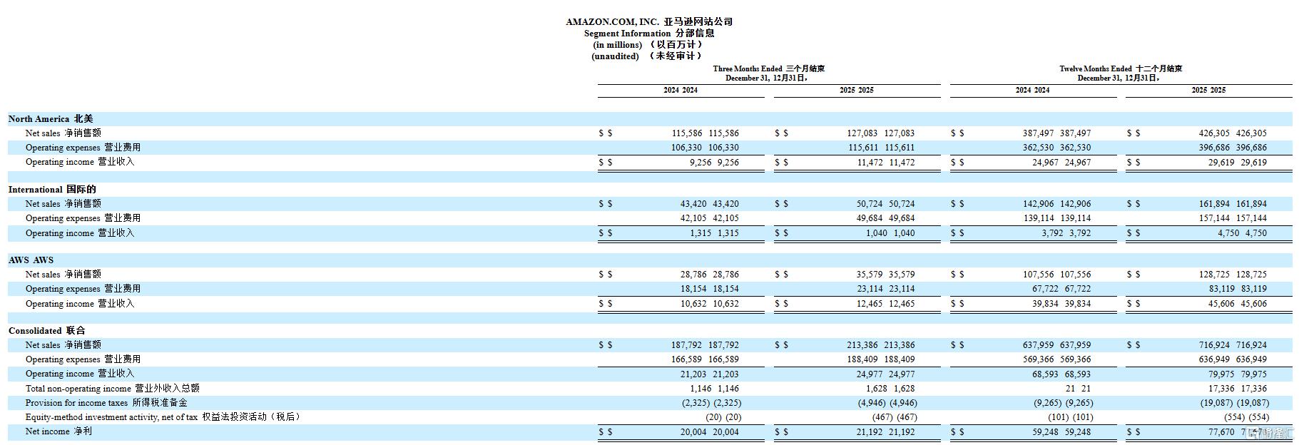周四美股盘后,亚马逊公布强劲的2025Q4及全年业绩。