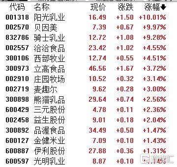 乳业板块拉升,阳光乳业、贝因美涨停,骑士乳业、冶洽食品、西部牧业、立高食品等跟涨。