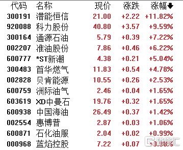 油气开采及服务板块上涨,潜能恒信涨近12%,科力股份、通源石油、准油股份、首华燃气、贝肯能源、洲际油气等跟涨。