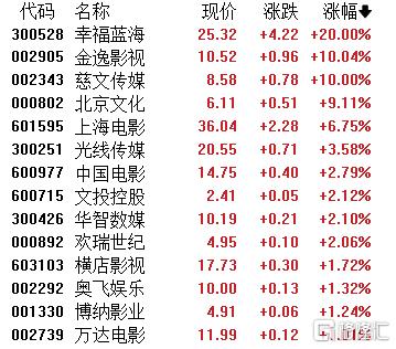 影视院线板块领涨,幸福蓝海20CM涨停,金逸影视、慈文传媒、北京文化、上海电影、光线传媒、中国电影等跟涨。
