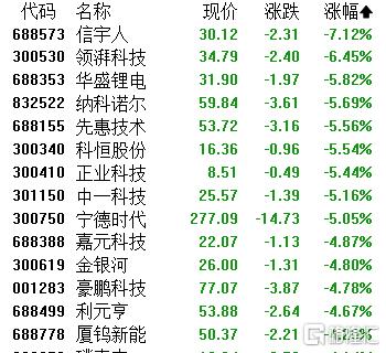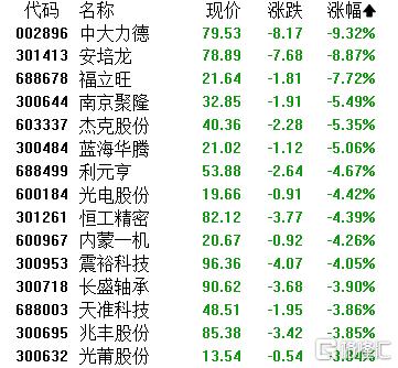 另外,电池板块下挫,信宇人跌超7%;人形机器人板块走低,中大力德跌超9%;多元金融、稀土永磁、跨境支付、智谱AI等板块下跌。