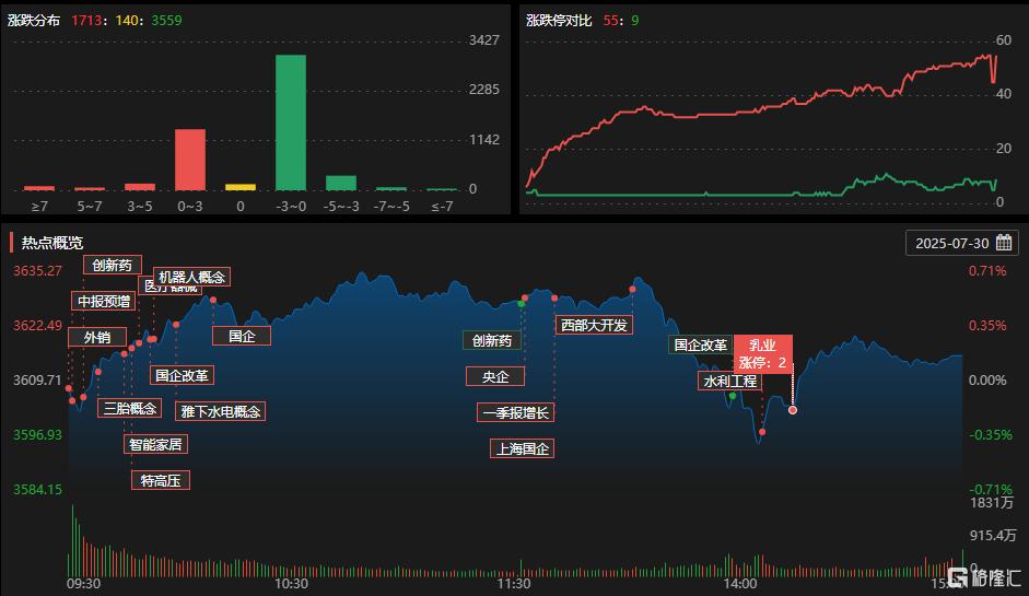 7月30日,A股主要指数涨跌不一,沪指涨0.17%报3615点,深证成指跌0.77%,创业板指跌1.62%。全市场超3500股下跌。