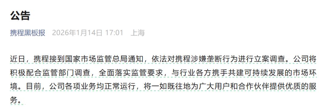 携程表示,公司将积极配合监管部门调查,全面落实监管要求,与行业各方携手共建可持续发展的市场环境。目前,公司各项业务均正常运行,将一如既往地为广大用户和合作伙伴提供优质的服务。