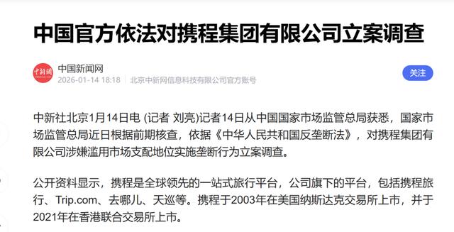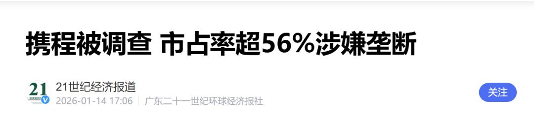 2026年国家市场监管总局关于反垄断调查的第一棒,挥向了OTA龙头,携程。