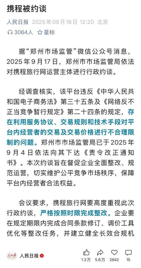 据人民日报报道,2025年9月17日,郑州市市场监督管理局依法对携程旅行网运营主体开展行政约谈。这一约谈源于此前多家入驻携程的酒店反映,平台通过“调价助手”强制干预酒店定价、阻碍功能取消等问题。